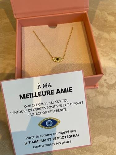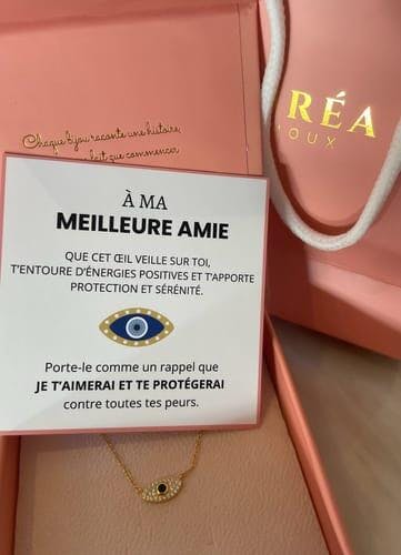"An meine beste Freundin, möge dieses Auge über dich wachen, dich mit positiver Energie umgeben und dir Schutz und Geborgenheit schenken. Trage es als Erinnerung daran, dass ich dich lieben und vor all deinen Ängsten beschützen werde."